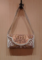 Buba Bag In White with Gold, and Pink Embroidery.......Buba of London has embroidered this white leather shoulder/clutch in gold metallic thread, and accented it with a soft peachy pink. Even the shoulder strap is embroidered and the edges whipstitched.