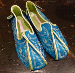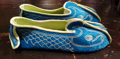 Capucine Children's Koi Fish Slippers/Shoes. Whimsical shoes in a koi/goldfish design. One can see the eyes on the front of the shoes, scales on the side, and a fin tail at the back. In a bright turquoise blue with lime green accents and trim. Also comes in red with purple trim.  Comes in toddler sizes, 2T, 3T and 4T.