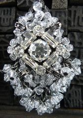 Erickson Beamon Ice Age Earrings for pierced earrings measure approximately 2 1/2" tall x 1" wide. Black swarovski crystal covers the post of this earring. A large diamond shaped central piece is covered with beads, baguette crystals, and a large round swarovski crystal. The back of the earrings is ornate and rhodium finished.