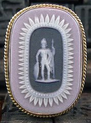 Estate Wedgewood Cameo Ring 14K Yellow Gold. Elegant large scale ring of a wedgewood cameo depicting a warrior with shield and spear. The oval cameo measures approximately 1 1/2" long x 1" wide set in 14K yellow gold. Gold roping accents the bezel of the ring. Size 8 and can be sized. A perfect middle finger or forefinger ring. The wedgewood is a soft lavendar pink with white warrior on a grey background.