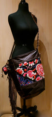 J.P. and Mattie Bohemian Tribal Fabric Shoulderbag with Leather Fringe. One of a Kind. Scraps of various leather compose the frame, strap, and fringe. Vintage fabric handmade by the H'Mong tribe in VietNam composes the body of the shoulderbag. Colors predominantly blue, red, and cream on the fabric. Long fringe, and a wonderful key fob accent the bag.