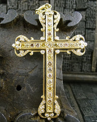 Large Vatican Cross from Loree Rodkin in 18K Yellow Gold with triple princess bale. Natural fancy diamonds vary from greenish yellow to canary to cognac (approximately 3 carats twt). White diamonds weigh 1.45 carats twt.