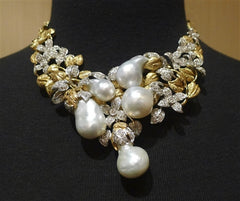 Necklace of 18K yellow and white gold has gourd shaped baroque south sea pearls ranging in size from 20-25 mm and diamonds. Approximately 5 cts twt of full-cut, round brilliant diamonds. Length is about 17 inches. Pearls are the ideal shade of white to coordinate with wedding gowns--just a thought out there for very special fathers-of-the-bride. Another beautiful Lorraine Schwartz design, featured by CHURCHILL, an authorized retailer. Post note: Patti LaBelle wore for her performance in Ford's Theater on network tv held in Washington, D.C.