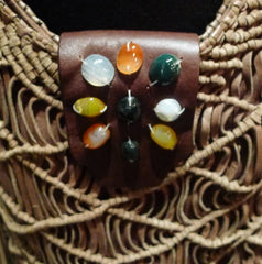 Orciani Fringed Suede Crossover Shoulder Bag with Stone Embellishment. The suede is woven in a cross hatch design on the body of the bag, and fringe extends from it. Interior is a tan cotton with a zippered pocket. Slouchy bohemian look, this fringed bag has a shoulder strap which measures approximately 27" long. The purse measures 11" long x 10" wide. The fringe extends from the bottom of the bag by 7". Polished stones in yellows, oranges, greens, and whites embellish the leather fold over tab closure.