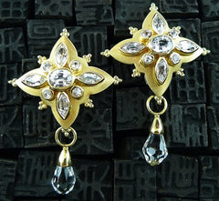 Outstanding one of a kind earrings from internationally acclaimed designer Paula Crevoshay. Here, five carats of white sapphires dazzle against starburst shapes that bespeak elegance and pizazz! Sapphire drops are dettachable so that starbursts can be worn separately. Paula also fashions many other stones to use as alternative gemstone drops. Contact CHURCHILL for suggestions.