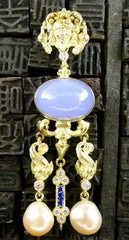 Yves Kamioner 18K Yellow Gold, Diamond, Sapphire, and Pearl Earrings for pierced ears. Earrings measure approx 2.5" in length, and 1" wide. Gorgeous cabochon chalcedony and lavender jade stones are the centerpiece of these exquisite earrings. Diamonds, pearls, and sapphires accent the earrings.